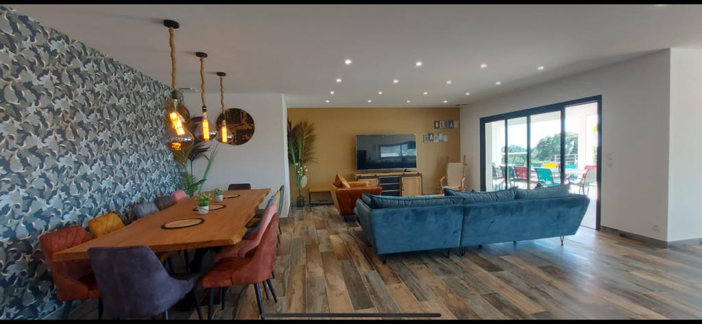 Une maison accueillant avec des prestations haut de gamme pouvant accueillir jusqu’à 14 personnes dans un espace ouvert, une cuisine américaine donnant sur le séjour.